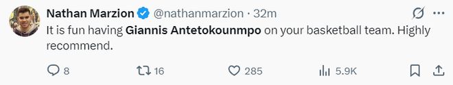 雄鹿記者Nathan Marzion:有揚尼斯-阿德托昆博這樣的球星在隊伍裏實在是太幸福了。