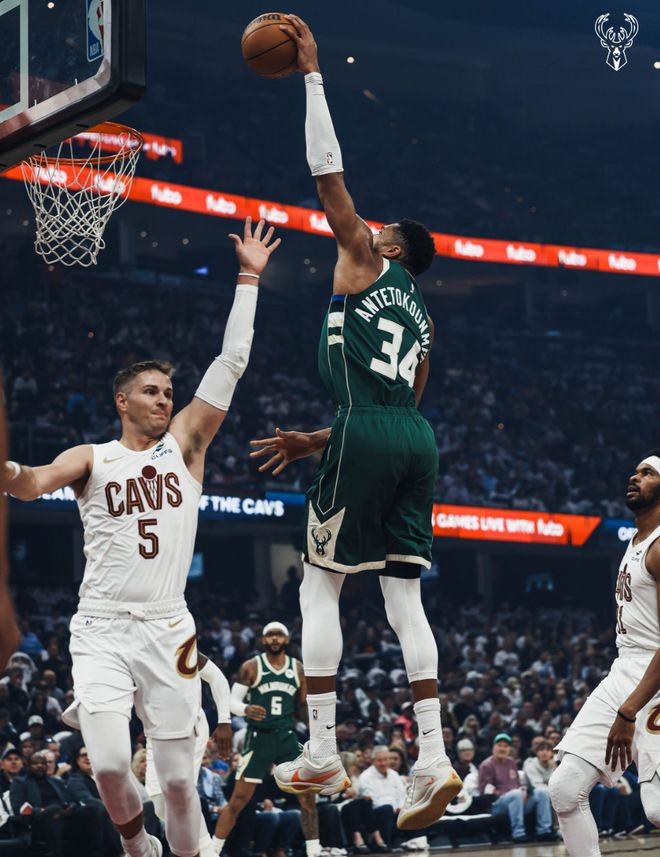 這支雄鹿隊陣容孱弱,延伸條款裁掉利拉德後就是揚尼斯單核帶隊,攻防兩端都需要靠揚尼斯一人支撐,字母哥除了要包攬球隊大部分的得分之外,內外線的防守也要一把抓,先到內線封蓋阿倫,隨後撲到外線去延誤米切爾,字母哥打得很累。